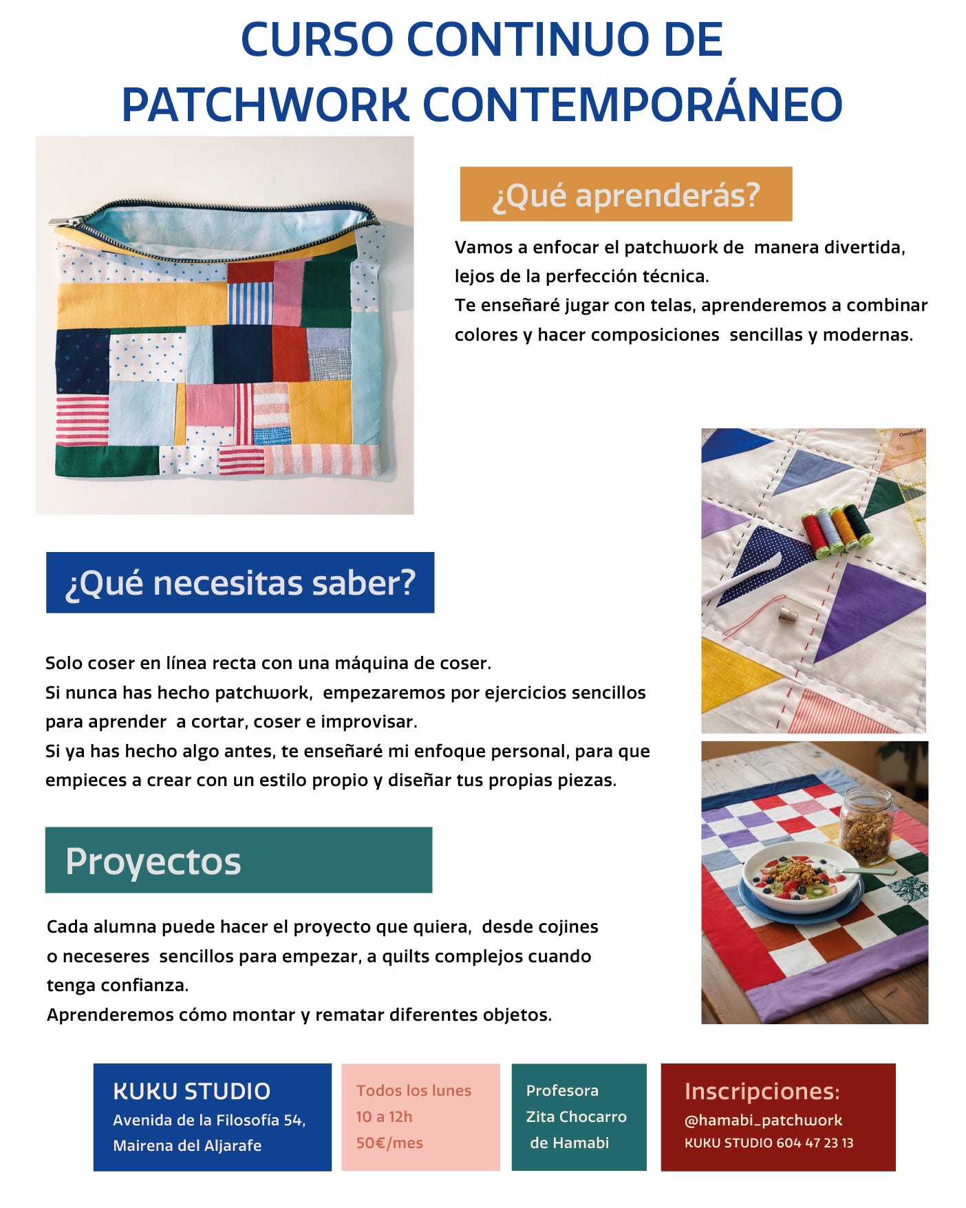 Y el lunes 2 por la mañana, empezamos clases continuas de Patchwork contemporáneo. Solo necesitas saber coser en línea recta con la máquina. Si nunca has hecho patchwork, empezaremos con ejercicios sencillos y resultones.